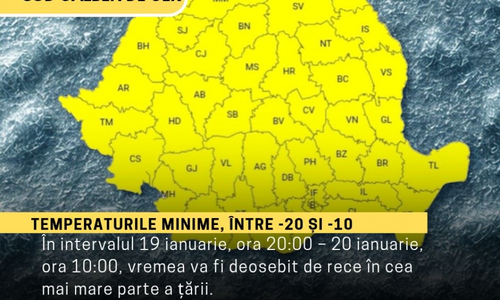 În intervalul 19 ianuarie, ora 20:00 – 20 ianuarie, ora 10:00, vremea va fi deosebit de rece în cea mai mare parte a țării.