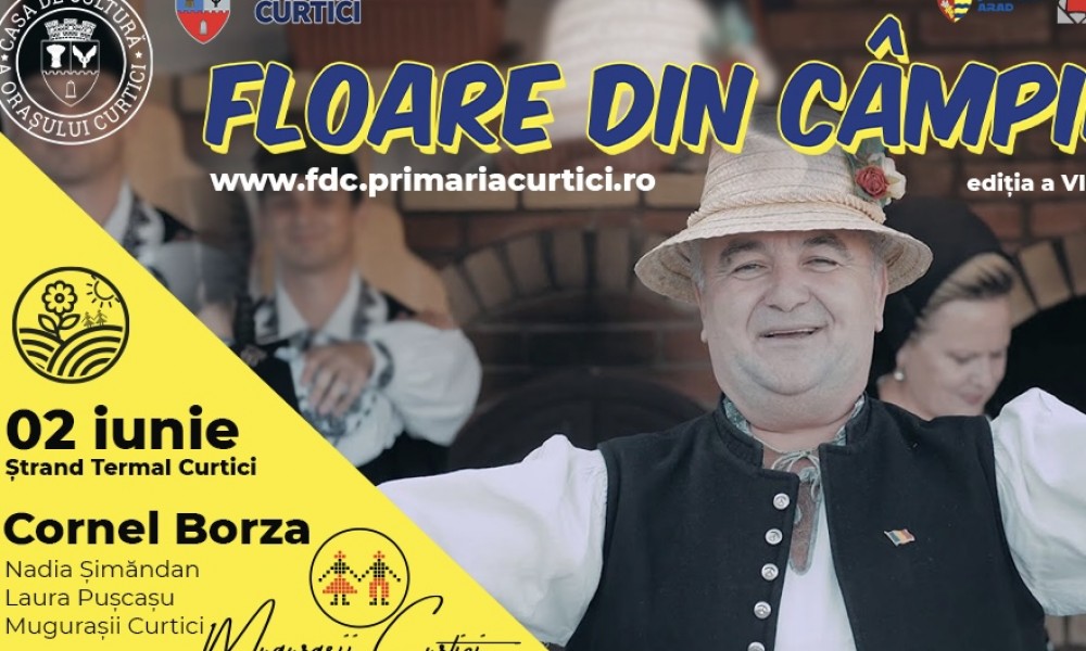 Avem plăcerea de a vă invita la cea de-a VIII-a ediție a Festivalului „Floare din Câmpie”, un eveniment dedicat tradițiilor și folclorului românesc. Festivalul va avea loc la Ștrandul Termal din Curtici, începând cu orele 14.00.