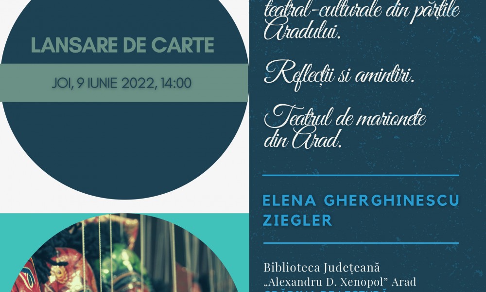 Joi, 9 iunie 2022, Biblioteca Județeană „Alexandru D. Xenopol” Arad organizează lansarea volumului „Incursiuni teatral-culturale din părţile Aradului. Reflecţii şi amintiri. Teatrul de Marionete din Arad”, autor Elena Gherghinescu Ziegler.