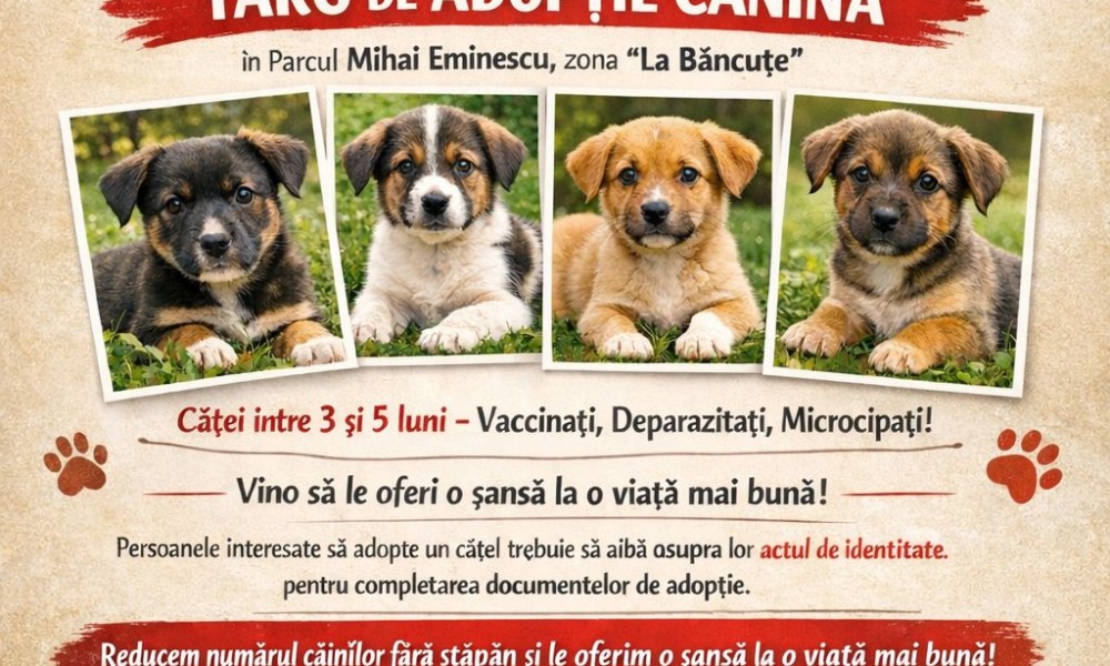 Gospodărirea Comunală Arad — Adăpostul Public de Câini Arad, în colaborare cu Primăria Municipiului Arad și Direcția Poliției Locale Arad, organizează un târg de adopție canină în Parcul Mihai Eminescu, zona „La Băncuțe", sâmbătă 14 martie, între orele 11:00 și 16:00.